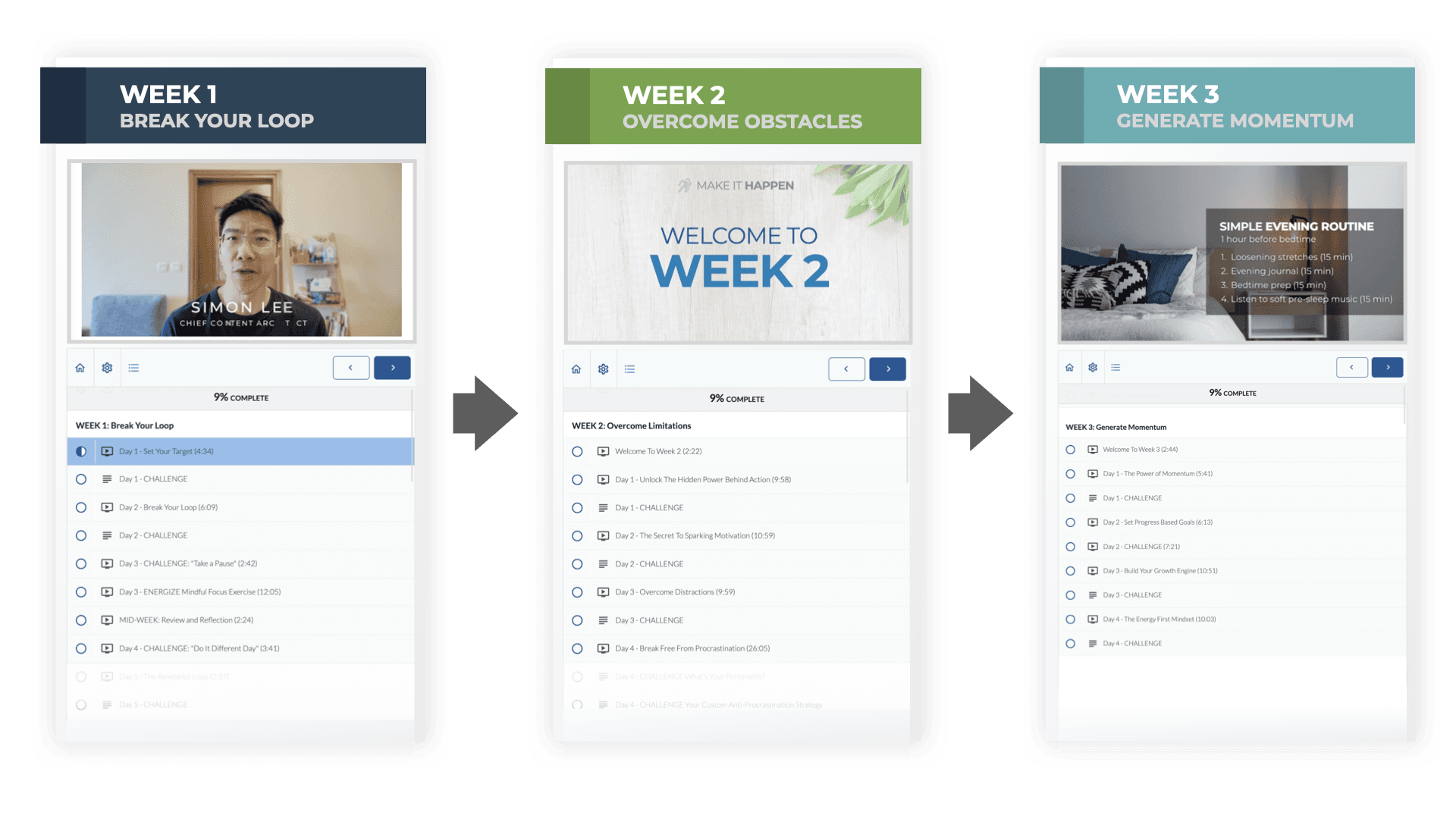 Make it Happen is a Step-By-Step 3 Week Course To Reprogram Your Mind For Success & Accelerate Your Life Goals.