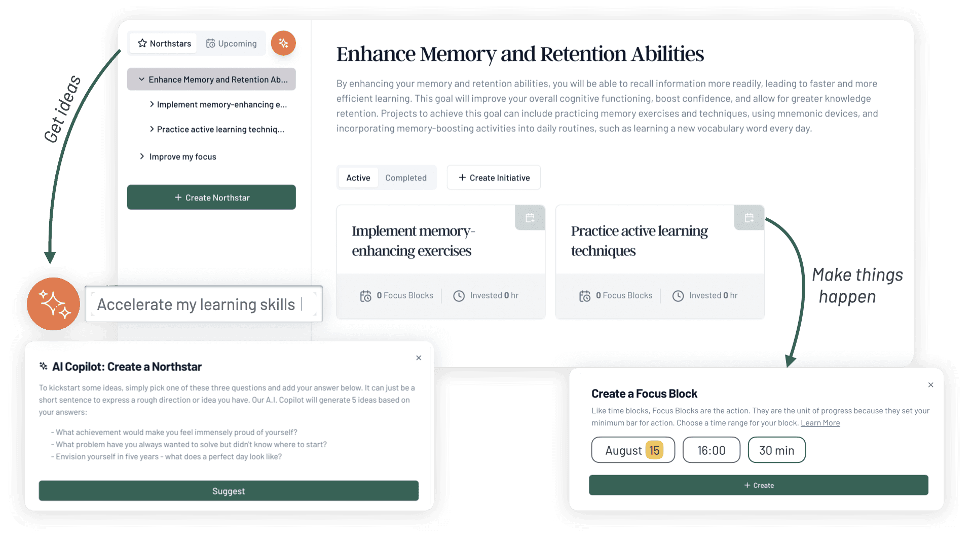 The Time Flow System simplifies progress into 3 simple steps. Set North Star goals, plan Initiatives and commit Focus blocks aligned with your true priorities. Create small wins everyday. Move the needle even in the busiest and chaotic schedules.