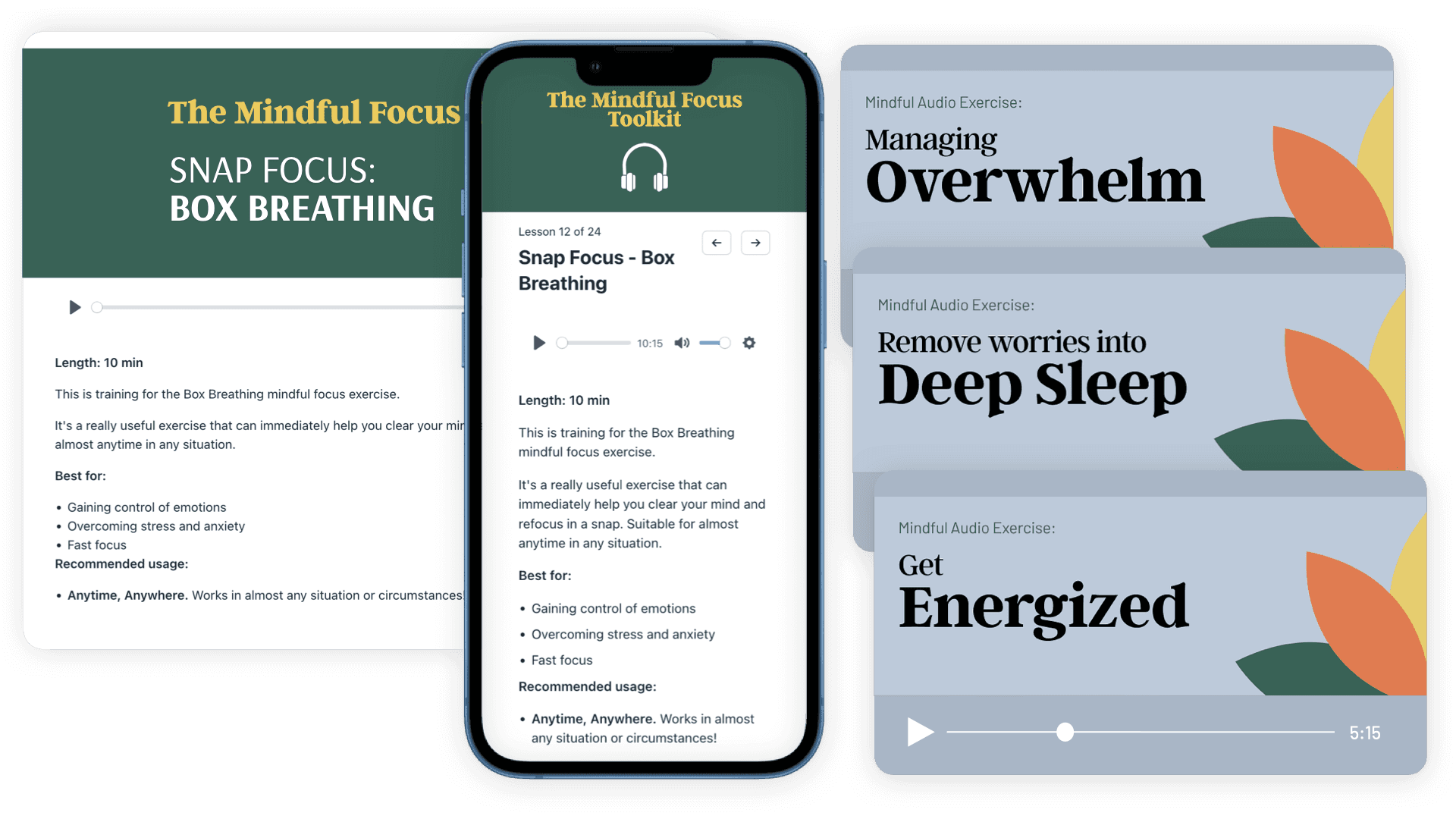 Is your mental and physical health wearing down with each day? Practice mindful exercises for every situation. Get your thoughts and worries back under control. Mindful practices are an essential part of mental and physical health. Even a simple 5 minute breathing exercise can immediately reduce stress and increase focus. Regain your energy and nurture your mind and body.