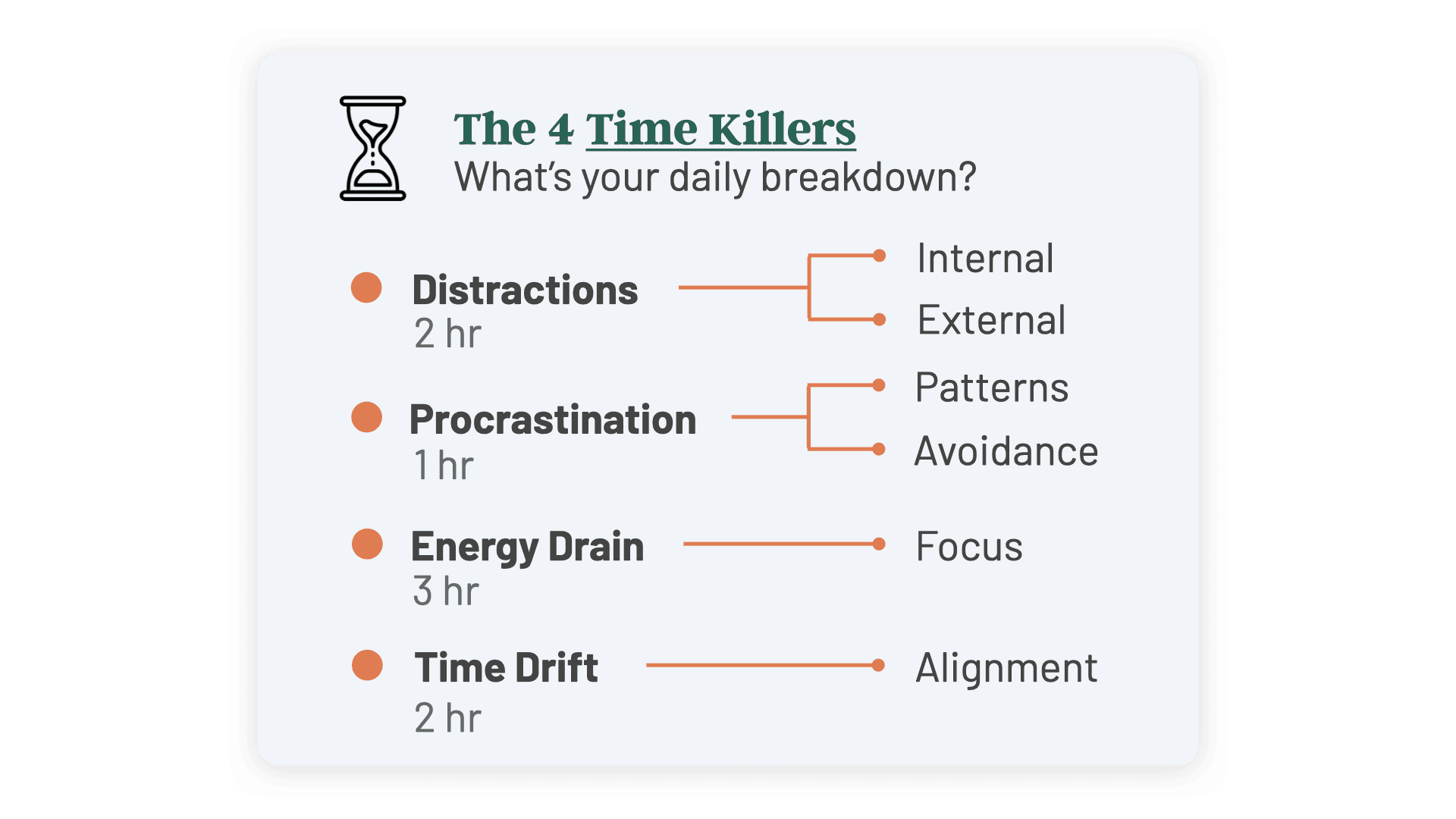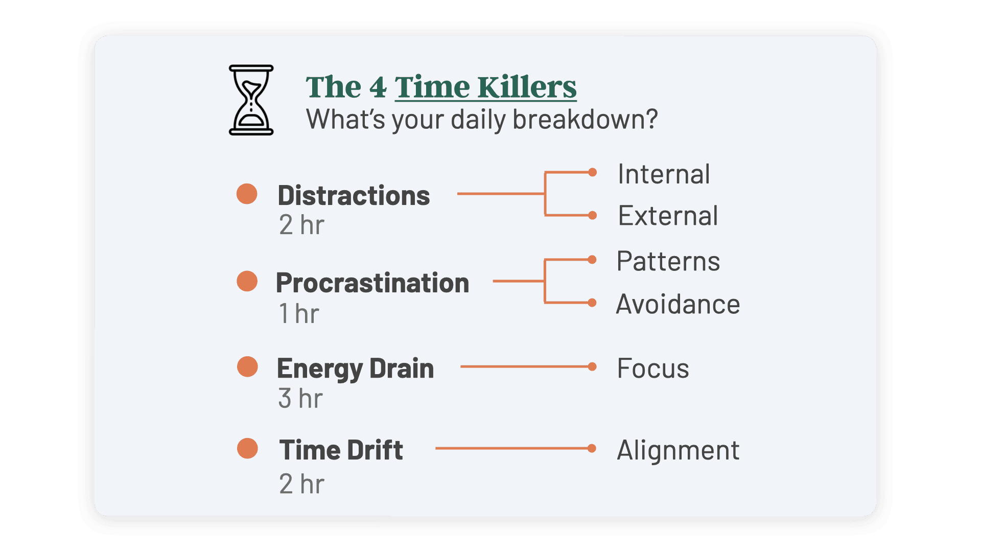 24 hours a day should be enough, right? But no, it's never nearly enough. Distractions, Procrastination, Low Energy, and Time Drift. These are the 4 Horseman of Lost Time. They seep into 90% of your routines and habits. Learn how to identify them. Practice strategies to eliminate them systematically.