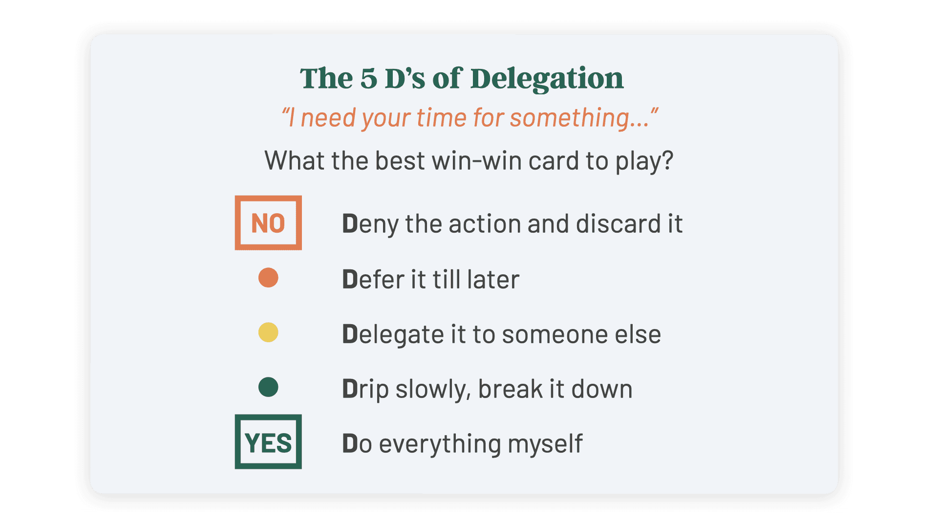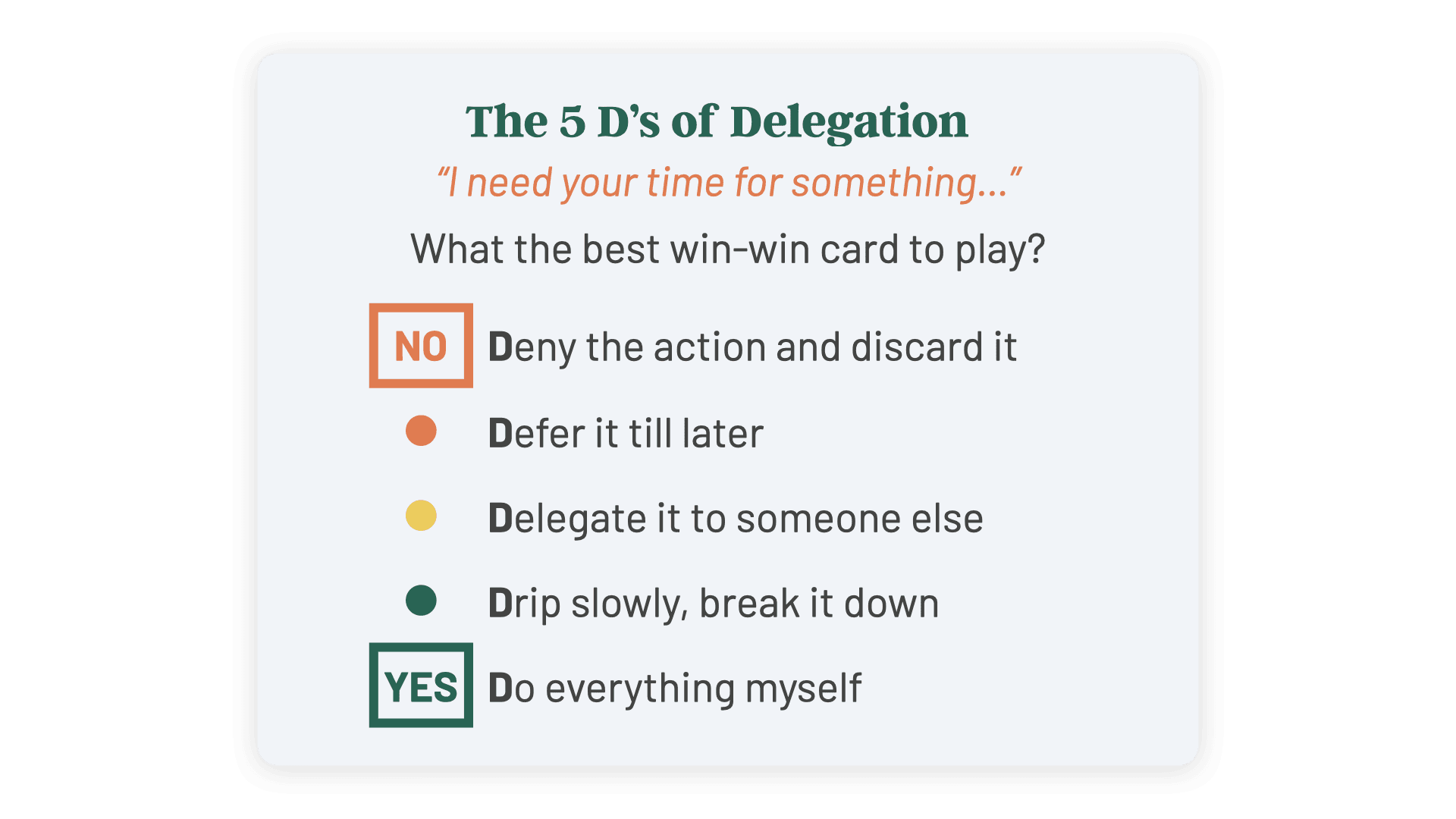 Are you stretched thin in a hundred different directions? There's a spectrum of choices between "Yes" and "No". Learn the 5 D's of Delegation to assert control and shape circumstances to your advantage. Set clear boundaries and communicate expectations the smart way. Play the right cards to create win-win situations with skill and finesse.