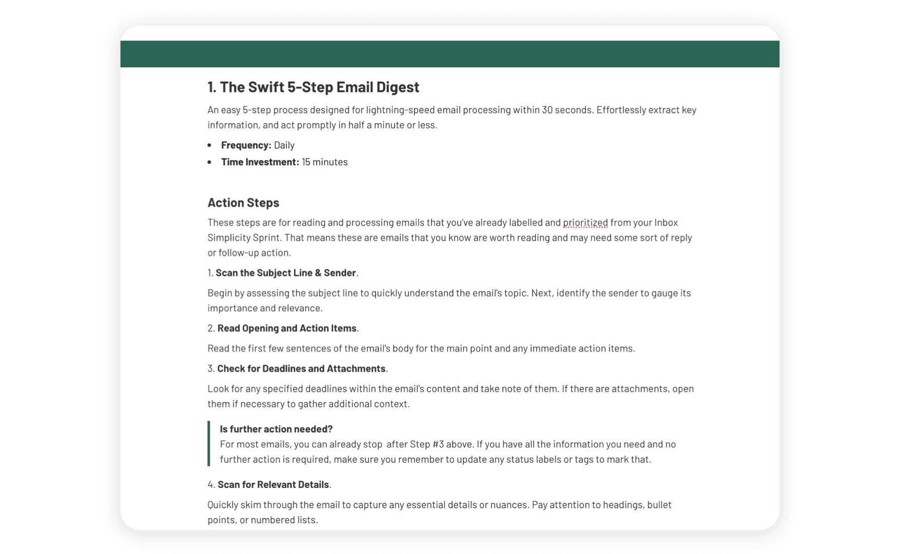 An easy 5-step process designed for lightning-speed email processing within 30 seconds. Effortlessly extract key information, and act promptly in half a minute or less.